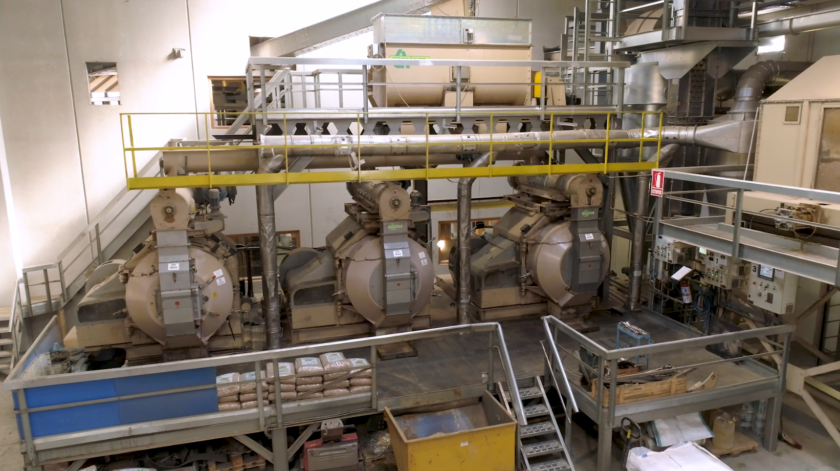 Aprovechamos el subproducto del aserradero (serrín y la astilla de pino) como materias primas del pellet, la corteza se emplea para obtener calor a partir de su combustión en la caldera de biomasa, reduciendo el grado de humedad de las materias primas hasta los valores óptimos necesarios en el proceso de granulación.
